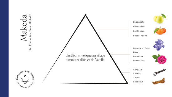 ETHIOPIE • Vanille et Santal chauds comme l’or le plus fin, Rose et Osmanthus transparents comme des cascades de rubis ; zeste scintillant de la Bergamote, verdeur immortelle du Lentisque et ronronnement sensuel du Labdanum et du Tabac comme l’odeur d’une peau brûlée par le soleil – Makeda est une hymne olfactive à la beauté légendaire de la Reine de Saba.