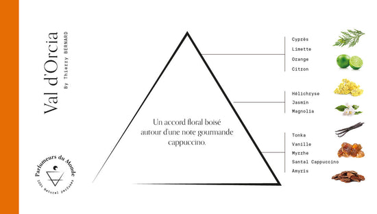 Notes de fond : Tonka, Vanille, Myrrhe, Santal Cappuccino, Amyris